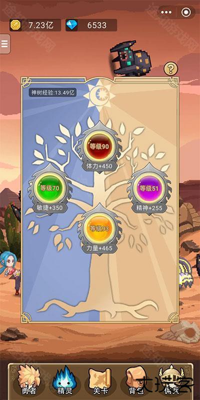 当你开启神树后,恭喜你,你的苦日子来临了,你会发现这玩意是个无底洞,压根填不满,所以前期需要针对性的去升级神树(也就是大家说的砍树),一般建议力、体互点,其次是敏、最后才是精神,我一般是4:4:1:1,后期可以多点一下体、敏。(有专门统计过的Excel表,但是太长了就不放出来了)
