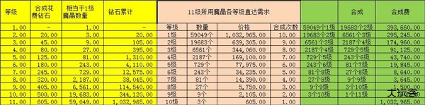魔晶前期有限黄白魔晶合成,然后是绿、紫、红。合成需要的详细数据参考下列大佬统计(数据来源——雪龙)