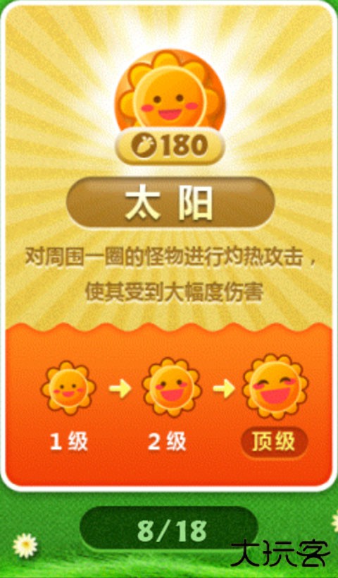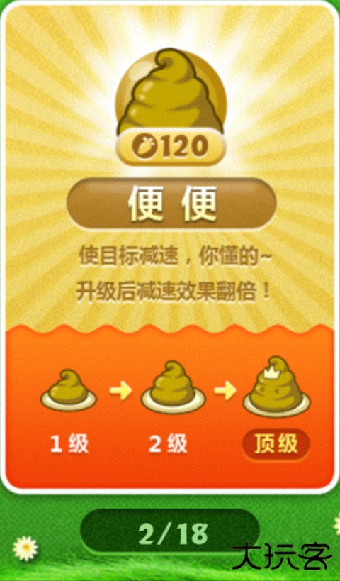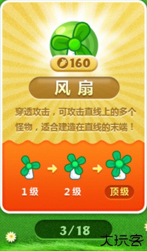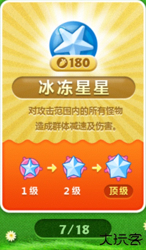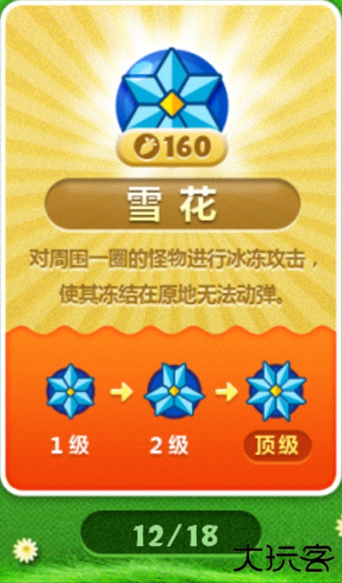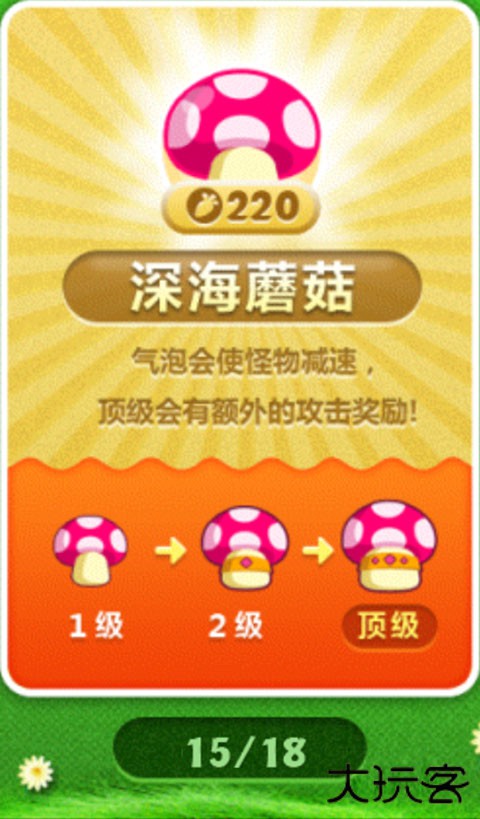 用来敛财的环绕群体减速炮塔,输出极低,但重点是能“敛财”,支持更多炮塔的建设。最佳用法是在怪物生成点附近大量种植蘑菇,然后再以大量输出在后面的路边严阵以待。可以种植蘑菇的关卡,一般不会缺钱。