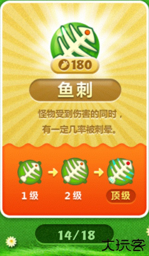 具有一定群体控制属性的单体伤害炮塔,输出还可以,用来攻击巨怪以及清道具皆可。一定几率的群体控制决定了其不仅能用作单体输出,还可以配合群体输出。特殊用法是大量鱼刺集中输出,可以达到不完美的彻底控制(毕竟还得靠几率),虽然不完美但比普通的减速靠谱得多,而且其本身能进行输出,在这种阵型下可以达到群体伤害的最终效果。