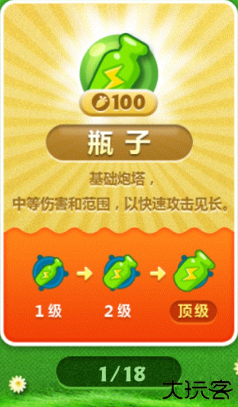 普通的环绕群体伤害炮塔,输出还可以,建议建造位置是最终伤害范围内总路径较长的位置(一般考虑5格以上)。对前期输出起到相当大的作用,而且可以边清怪边清周围道具;后期输出能力因地图而异。当然,主要针对小喽喽,结合减速塔可以克制飞行怪,对巨怪输出较低。
