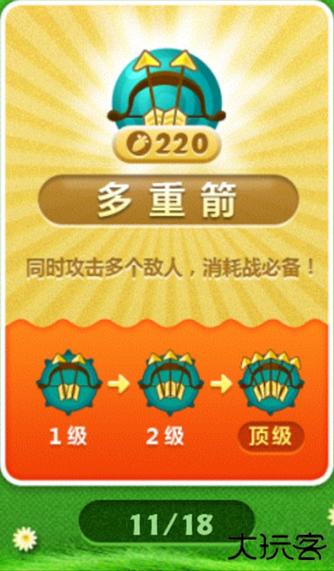 普通的多体伤害炮塔,兼具爆发伤害和群体伤害的属性,放在路边可以在最近的一格产生爆发式伤害(多支箭伤害的叠加)。主要克制巨怪,对付飞行怪和小喽喽还可以,也比较适合用来清道具。