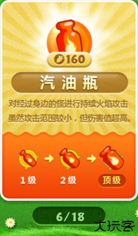 “对经过身边的怪进行持续火焰攻击,虽然攻击范围较小,但伤害值超高。”