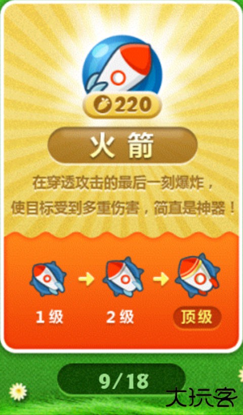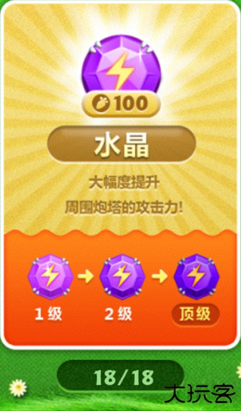 高伤害单体输出炮塔,如描述所言,基本上就是用来对付巨怪的,以及帮忙清道具。升到顶级比一般炮塔价格高,在布局时要记得这一点,避免因为钱不够导致小怪漏过。