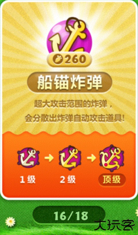 特殊的溅射群体伤害炮塔,输出一般。是对新手比较友好的炮塔,因为新手一般会对清道具比较头疼;但对熟练玩家可能就不太实用了,毕竟清光道具后,船锚塔和星星塔的区别就不大了,价格又高于星星塔许多,而熟练玩家又很熟悉清道具的技巧。一般在道具全清后就可以拆掉改建其他炮塔了(除非本关只有这么一个群伤)。