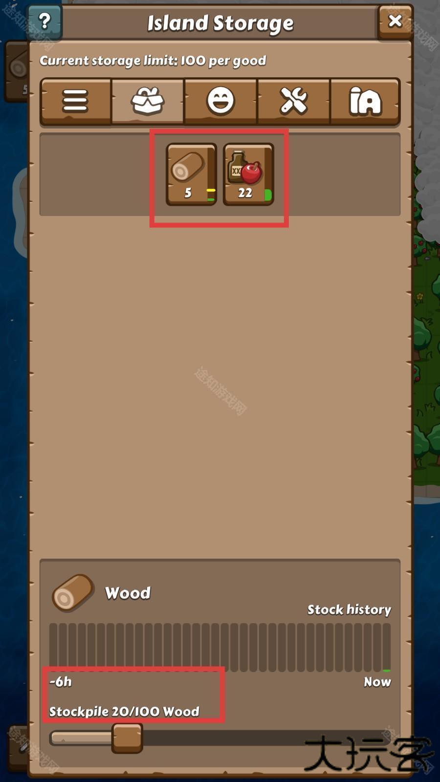 3、进入【IslandStorage】界面,可查看木材(5)、苹果酒等资源的存储情况,同时关注木材的存储进度【Stockpile20/100Wood】。
