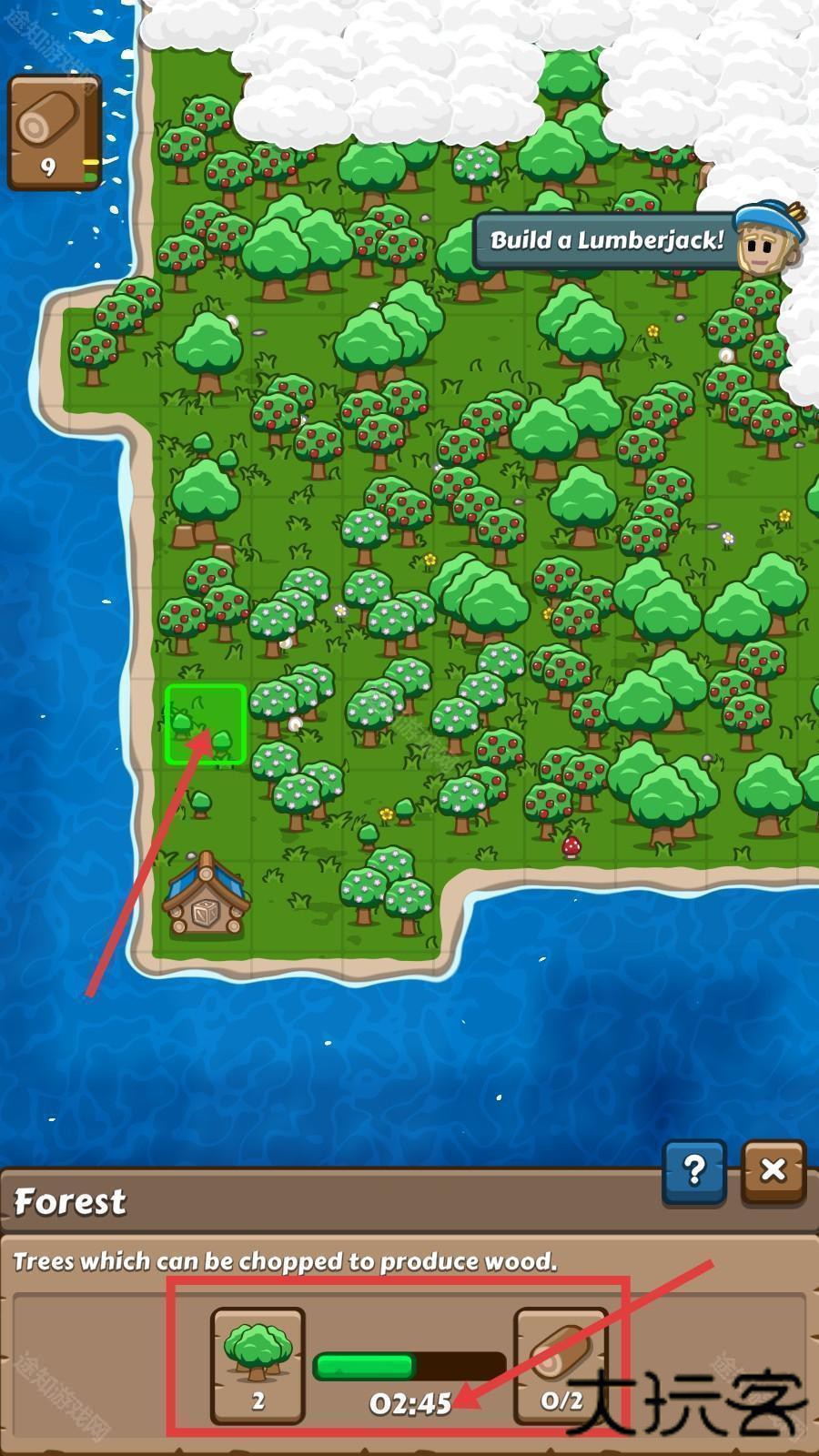 4、根据提示【BuildaLumberjack!】,在指定绿色区域建造伐木工,利用2棵树,耗时【02:45】,目标获取【0/2】木材,提升木材获取效率。