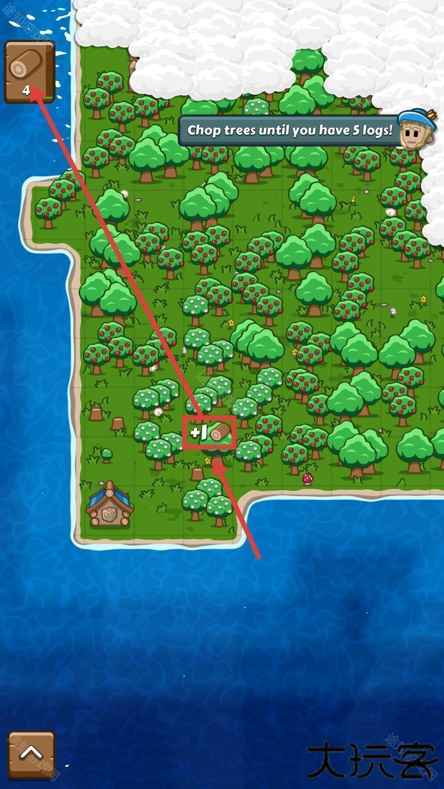 1、根据提示【Choptreesuntilyouhave5logs!】,点击岛屿上的树木,每次砍伐可获得【+1】资源,开始收集木材。