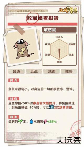 原来是敏感鼠啊,一个瘦弱又坚强的小家伙,但是如果小看他的话,你肯定会后悔。虽然攻击力不高,但是一旦数量上来,那就完全不能小噱。善用木法技能、水法技能,相信一定能有不错的效果。