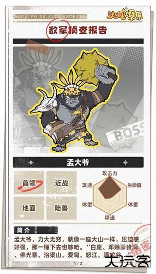 首领孟大爷有三条生命,并且攻击力极强。好在孟大爷的移动速度缓慢,主公需要在孟大爷靠近前就把TA消灭。相信我主公,你不会希望TA出现在你面前的,可能邦邦两锤子,你人已经没了!