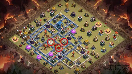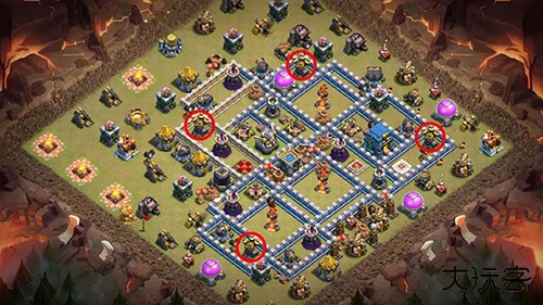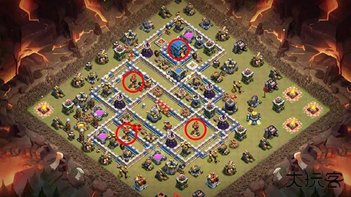 阵型以天鹰火炮和部落城堡为核心,多头地狱塔围绕核心区域组成防御区。防空边置,对空军流派也有不错的防御效果。