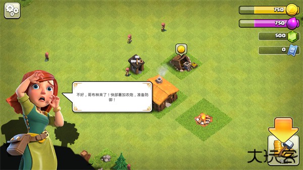 2.进入游戏,可以看到我们家园受到了哥布林攻击,购买武器和建筑,开始发展自己的部落。