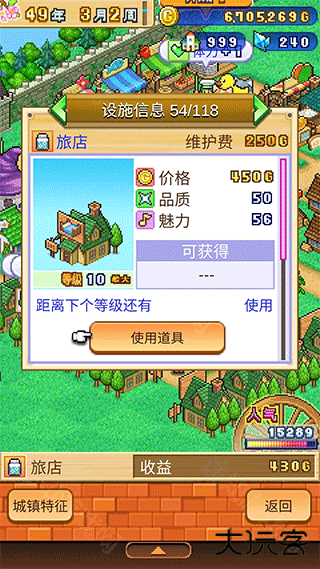 速刷金钱法:只摆当前等级满属性旅店、武器店、防具店、饰品店,总数摆够30个,不放绿化,这样每年收入就很高了
