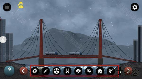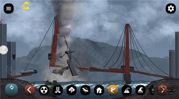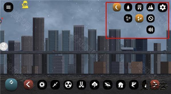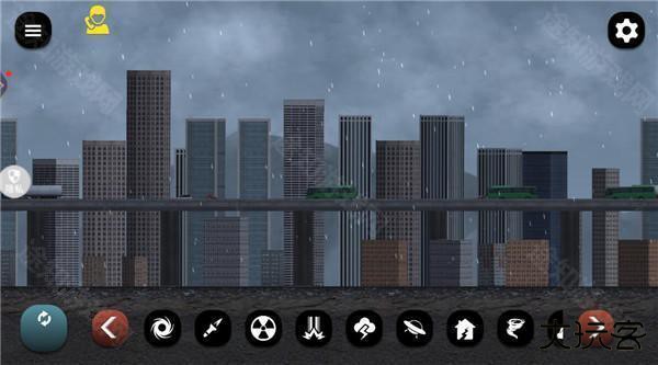 1、打开游戏,可以看到底栏有多种灾害手段,像是龙卷风、核弹、飞碟、地震等等,可以任意选择一种灾害来破坏城市,非常的过瘾