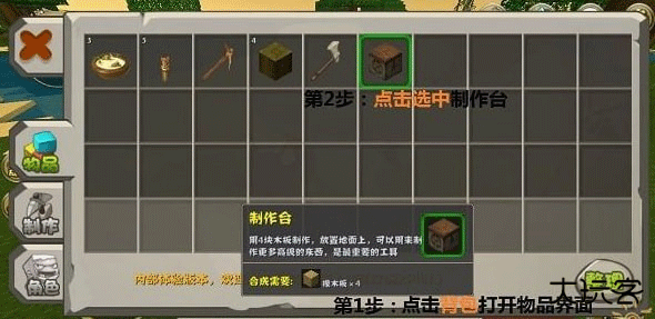 制作台在地上,再点制作台才能打开制作界面,才能合成道具