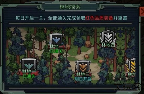 11、林地探索。连续挑战后有红装奖励,难度低,速度快,伐木机升级也在这个地图;