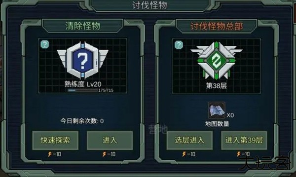 4、清除怪物&怪物总部。清除怪物是一个怪物密集的图,每天三次,建议开双倍卡进去打经验多多,怪物总部地图在清除怪物里获得,每天三张,如果打不过可以存着。升级装置可以加强在总部的属性抗性等。这个图还是挺重要的,后期难度也随着提高,不过新手到那时候已经是老手了,应该能解决;