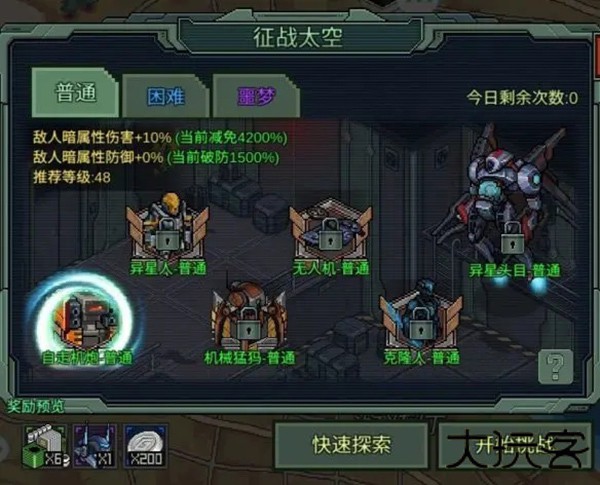 13、征战太空。玩到这个要48级,机甲产出地图,注意进入前可以看到自己对敌人的减伤和破防,减伤不满怪对你伤害会提高,破防不够你打他都是1血,随着机甲部件增加,免伤破防属性提高,也就可以打的更深入,这里还可以制造机甲部件。材料也在这里获取。只要有时间,红色部件打造不是梦。
