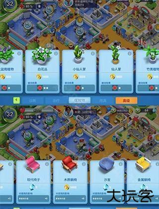植物会增加健康值,沙发会提高快乐值,还有雕塑也能起作用。当病人路过雕塑植物时,双值就会增加。随着等级的提高,会有更多的医院装饰品选择和升级