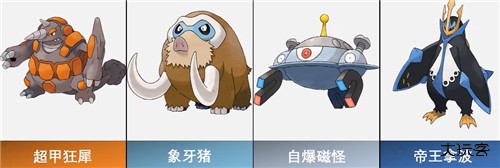 T2:路卡利欧、仙子伊布、幽尾玄鱼、劈斧螳螂、超甲狂犀、象牙猪、自爆磁怪、帝王拿波、火爆兽、月亮伊布、卡比兽