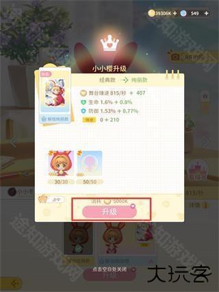 14、点击可以升级的小小樱,点击“升级”即可解锁新的战斗服