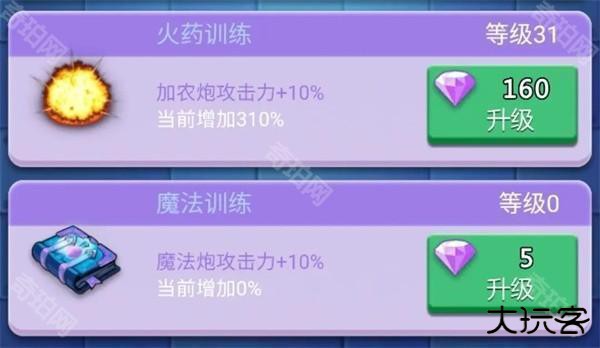 3.加农炮和魔法炮训练,这个钻石充足的时候,适当升级,主升火药训练,原因会在第二部分炮台那里讲。
