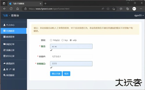 1、下载【飞鸽内网穿透器】,在飞鸽-控制台,开通并设定一个穿透隧道,协议选择为:udp。端口:7777