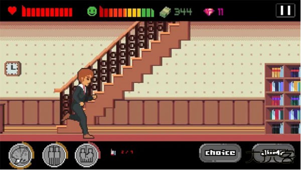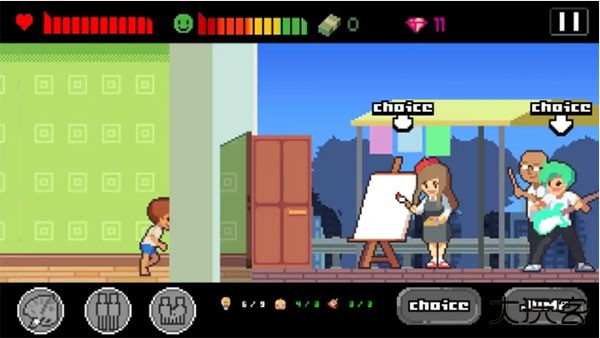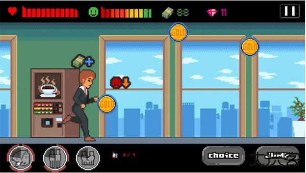 6、工作阶段一号!赚钱吧少年!up这是五项全不到九的职员路线,收集钱币赚取工资(商城可增加对应职业单金币收入)每个职业有自己特别的选项,根据你的属性(隐藏)来决定成功与否,是否成为成功人士,值得注意的是赚钱的时候会减幸福度(工作就输了——大老师)小心自杀哦,食物会加幸福度,烟会减少健康度集齐七个香烟即可当场去世,注意规避。