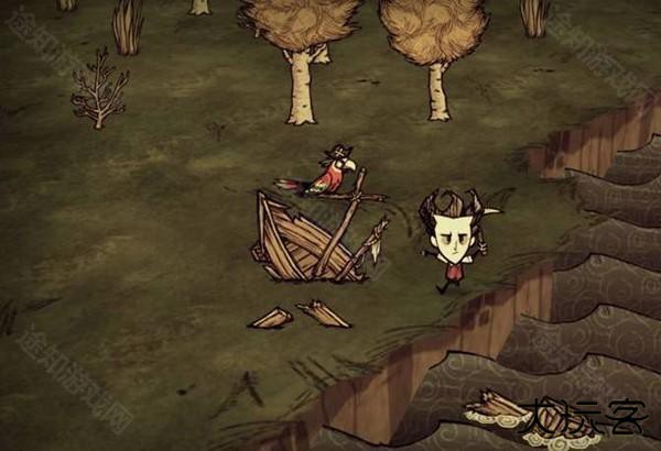 2、进入饥荒巨人国,然后在地图边缘上寻找沉船,沉船的特征是一半在岸上,一半是卡海里,船杆上停着一只戴海盗帽的红色鹦鹉。
