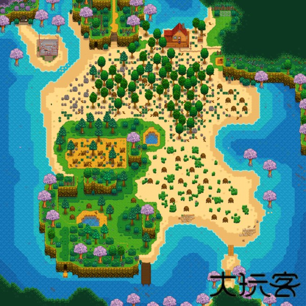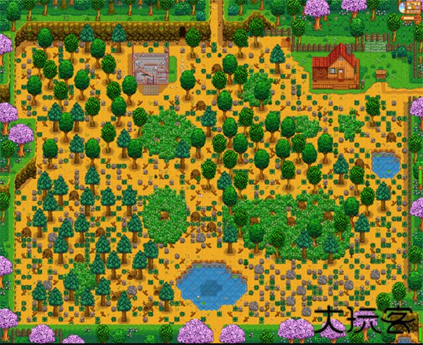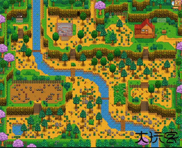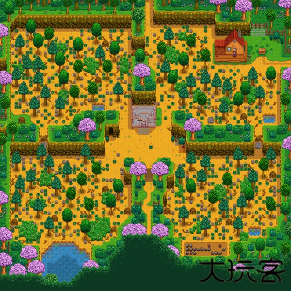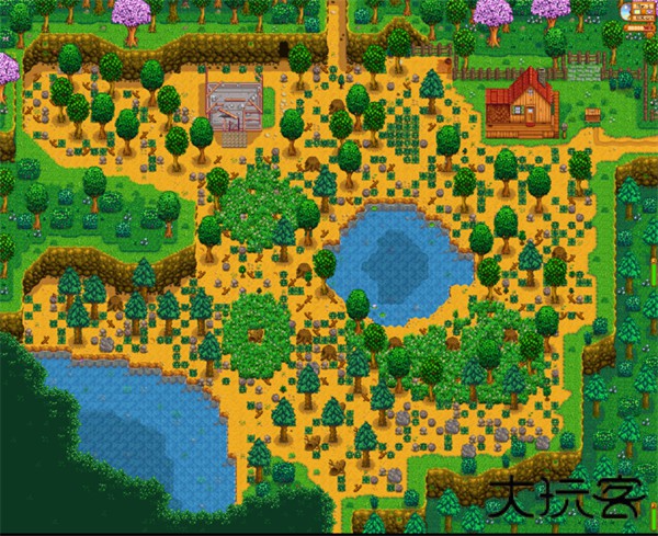 地图地块面积很大,且除正下方与右边的两个池塘以外大部分都是可耕地,是种植农作物和饲养动物的理想选择。