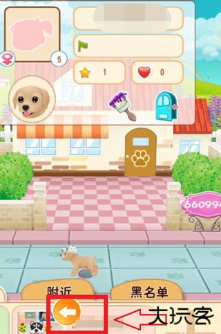 4、此时在狗栏这会揭显出一个白箭,按这里方可进到此友的舍堂了,于此里面的狗狗也会迎来。