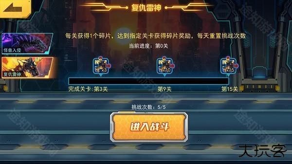 复仇雷神:每关获得1个碎片,达到指定关卡获得碎片奖励,每天重置挑战次数