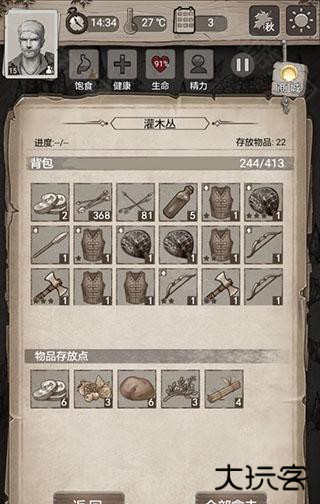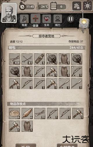 掠夺者营地很肥务必推掉,时间很充裕可以一天推一点。本关结关需要活18天,打完所有点之后每天就是找威利换石片,然后隔几天走一遍资源点。如果觉得食物压力大,请在推完营地后给二号人物断粮