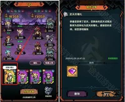 4、抽卡比较非酋的小伙伴也不要着急,有个小技巧,这里给的武天免费试用次数,先不要用,也就是不要让他上阵,等到1-29和1-30的时候再用他来帮助我们完成通关。另外,武天的试用次数没用的话,等抽出武天的时候还有意外惊喜。