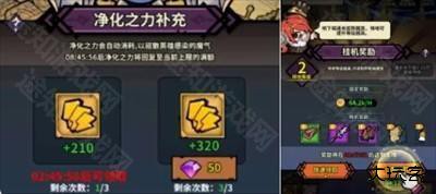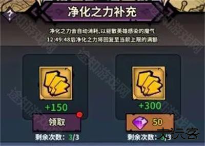 净化之力每天可以免费领取3次,分别在8点、12点、18点提供,另外可以消耗钻石购买净化之力。每天的0点,如果净化之力未达到当前净化之力的上限,会自动回满,主城等级越高,每日免费领取和购买的净化之力的值也更大;且领主的净化之力上限也更高。游戏内个别活动也会提供净化之力,净化之力获得后可以在背包里使用,也可以通过净化之力界面使用。