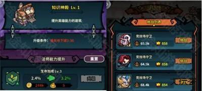 知识神殿分别为战士、弓手、法师三种职业增加多维属性。同样因为资源有限,前期我们优先升级:法师的生命,战士的闪避和生命,顺序:法师生命>战士闪避>战士生命。