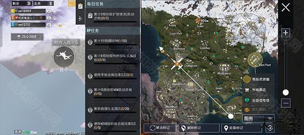 3、我们需要与其他96名玩家进行竞技,首先我们需要进行跳伞,打开地图选取安全的位置跳伞,找到一个安全的地方进行收集物质,尽量和队友跳一个地点;
