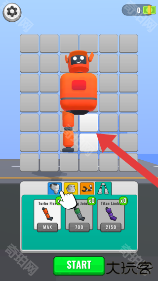 2、游戏是合成或建造类玩法,画面中有橙色机器人形象,下方有“TurboFlex”“Joint”“TitanLeg”等物品选项及对应价格,还有【START】开始按钮。