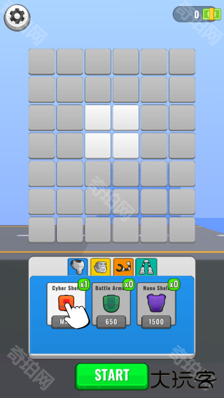 1、属于放置或合成类玩法(从下方可选择物品放置到上方方格、有【START】开始按钮),能看“CyberStrike”“BattleArms”“NanoSkin”等物品及对应价格、数量。