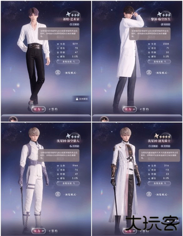 以沈星回为例,五星“逐光骑士”与四星“深空猎人”套装相比较:“逐光骑士”基础属性面板较高;