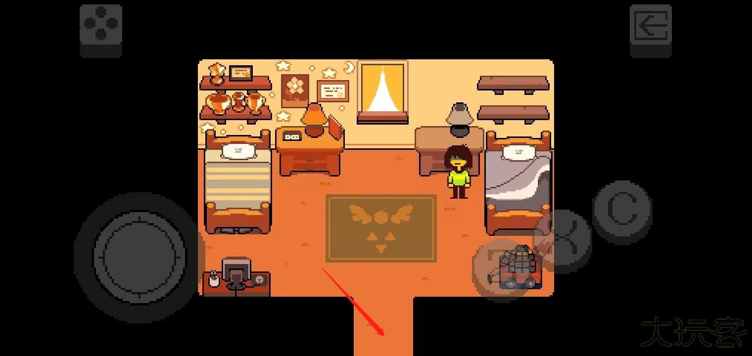 4、之后就正式进入游戏了,托丽尔喊着克里斯(Kris)的名字,让他上学不要迟到了,(按“乙”键进行下一步),玩家需要控制Kris让其起床出门去学校;滑动左边的控件让Kris走到箭头指示的那里,然后就会切换下一个场景;