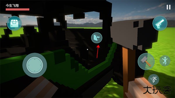 8、走到刚放好的汽车旁,点一下 开门按钮 上车,坐稳后就能直接 驾驶 它在世界里兜风咯!