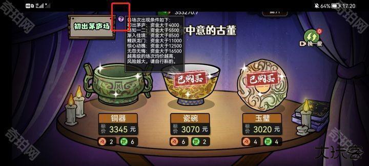 点问号,对于新手(胆小的)来说,初出茅庐场是非常非常适合滴(比如我这个既想赚钱钱又想开心的抠门鬼)!点击换一批就可以刷到,要是刷到无怨无悔场,立马再点一次(比如我这个蠢货买了个黑心赝品,真是离谱的惊心动魄)!