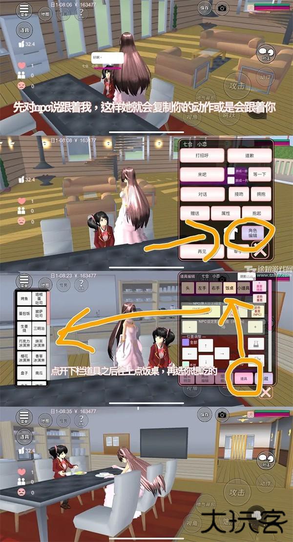 最后这部不难操作,但是需要一些耐心:给npc点好菜之后保持让她跟着你的状态(即不要跟她说等一下)找一个离她稍微远一点但别太远的位置,不然她会离开自己的位置跟着你,离太近也容易你俩的操作重叠。找到合适的位置坐下之后你吃就可以了,她会跟着你一起吃的