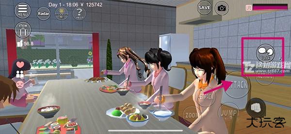 可以跟朋友在家恰饭(打开图中这个对话键,在衣服图标旁边那个设置那里点开,在最底端找到item,这时候列表上面就会有可设置在各个地方的物品,选桌子就可以选菜给自己和朋友了)因为Sakura更新到中文版,很多东西都跟以前的不太一样,但操作大致上是一样的,只是新版的灵敏度好像更高了。