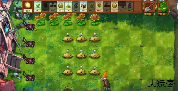 2、使用高于向日葵高度的坚果保护一路,其他路可以都种上“豌豆土豆雷”和“豌豆坚果墙”。