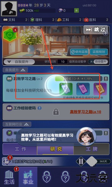 3、进入【研究】板块,关注【高效学习之路】等项目,通过提升等级获取全科技研究经验加成,可点击完成获得研究经验,助力角色成长。