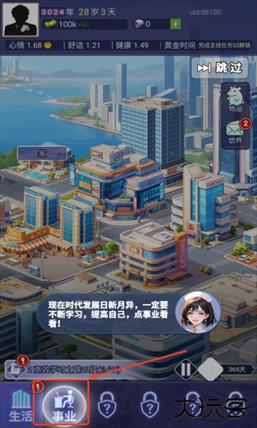 2、重视【事业】板块,时代发展迅速,需不断学习提升自我,点击相关功能入口,规划事业发展路径,解锁更多游戏内容。