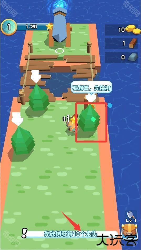 2、靠近树木后连续点击砍伐按钮,积累足够数量的木材用于后续建造桥梁和其他设施。