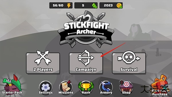 1、打开火柴人弓箭手,首页会显示三种玩法模式:左侧是无尽模式,中间是闯关挑战模式,右侧为多人线上模式。